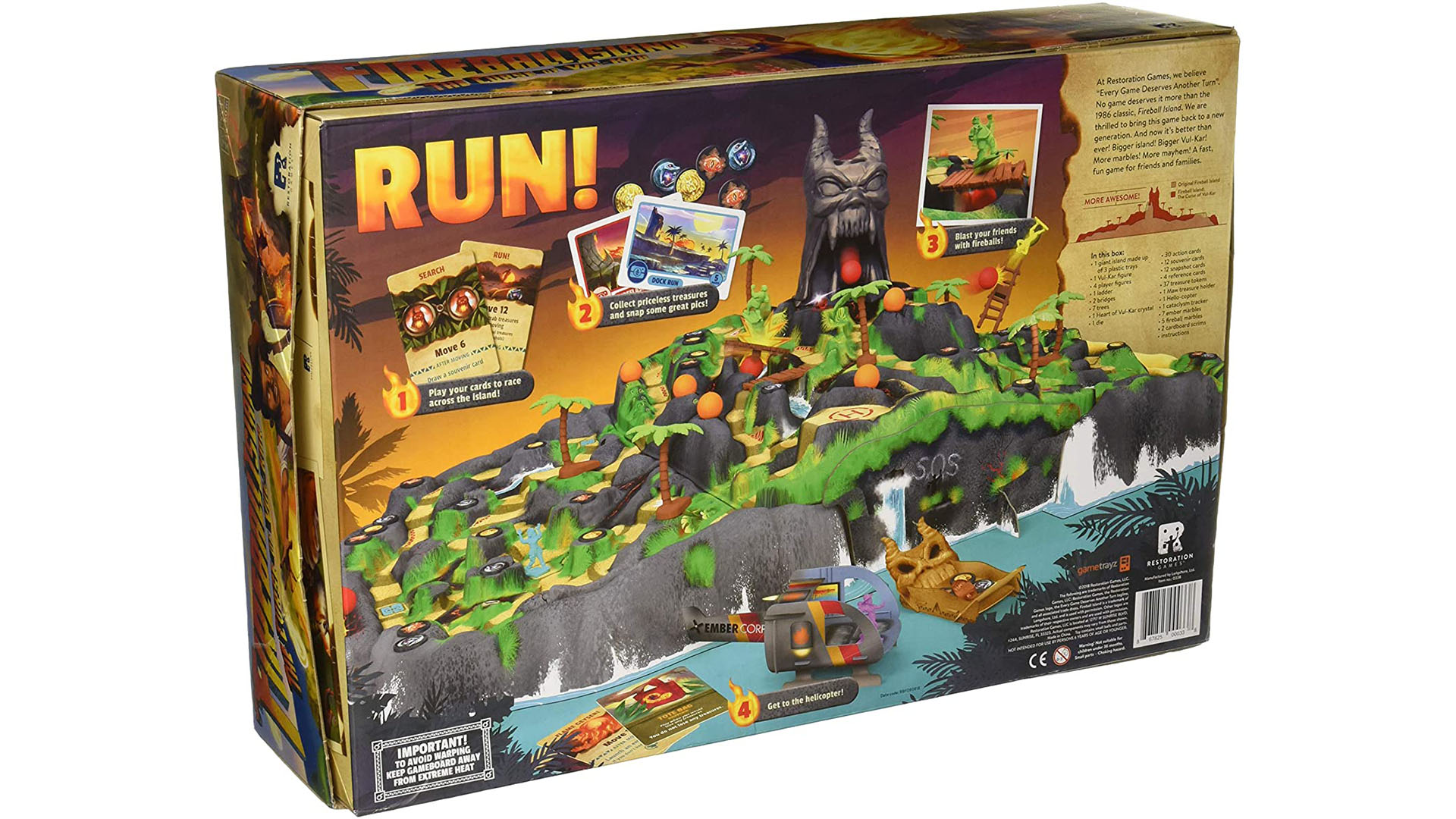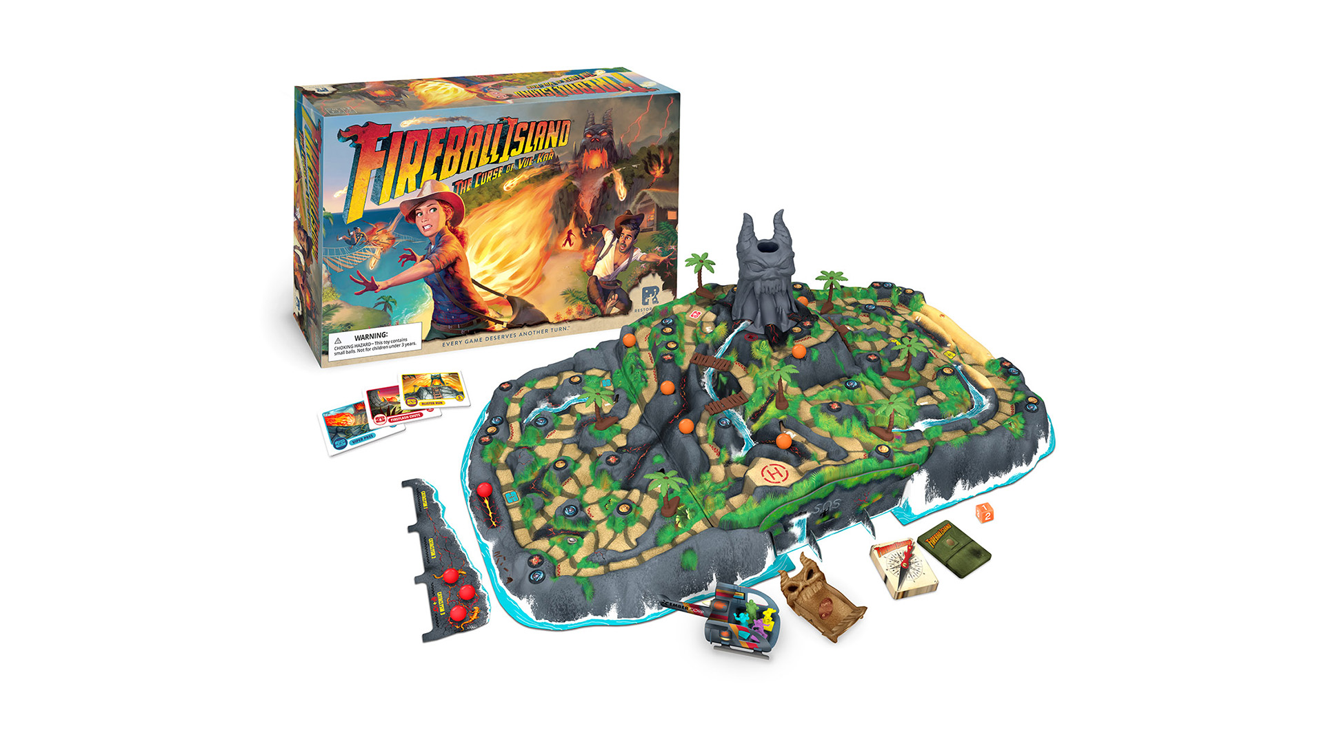 Fireball Island: The Curse of Vul-Kar is a restoration of the classic 1986 game Fireball Island that features a unique 3D island and a host of marble mayhem. This new version boasts an island that is even bigger than the original (and yet fits in a smaller box) and more marbles. It is a family-weight game for 2-4 players (5 with an expansion) that plays in 30-45 minutes. Simple card play replaces the random roll-and-move of the original, and the set collection for the treasures offers some interesting choices for players.