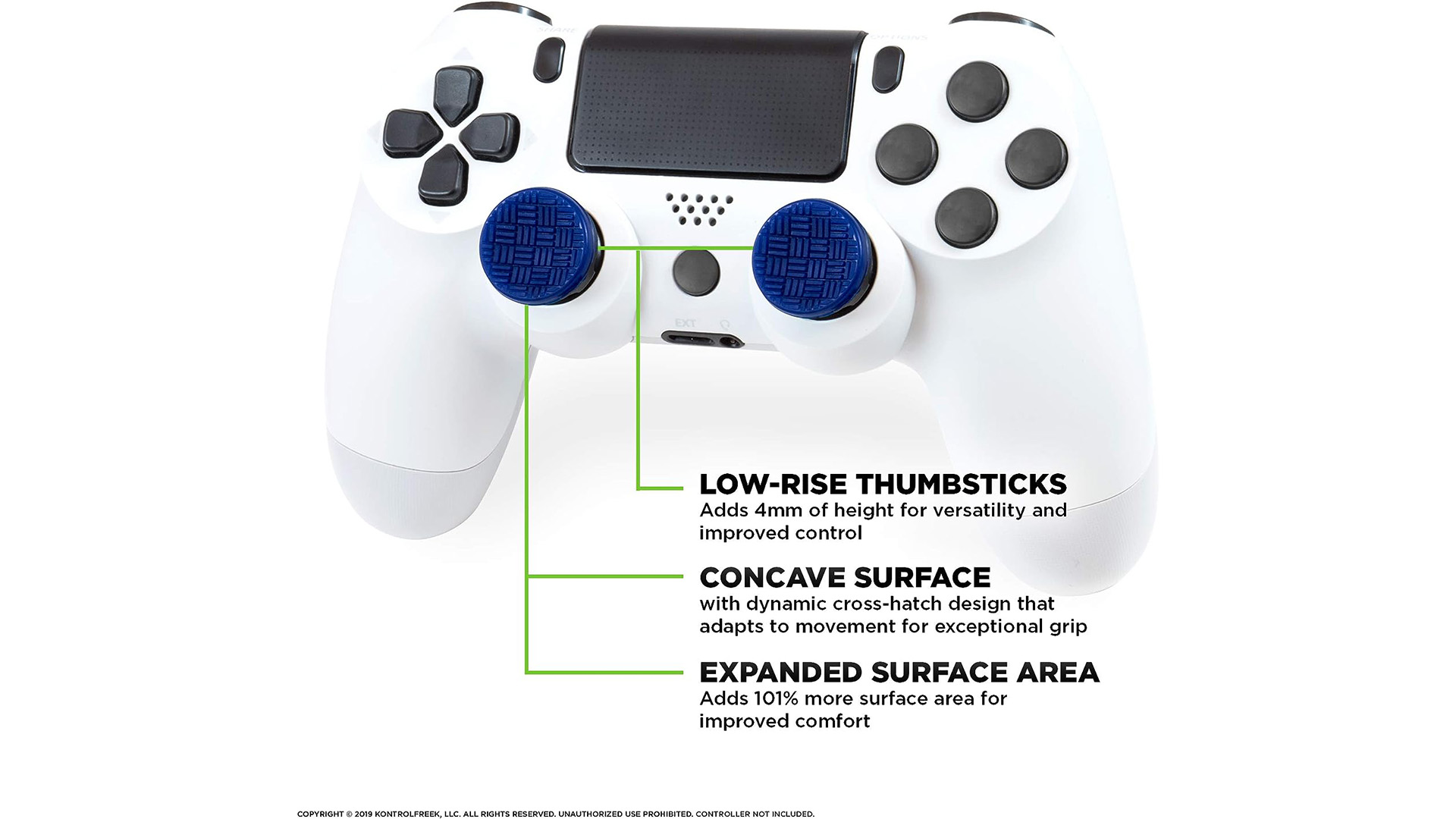 KontrolFreek’s Omni is a versatile, low-rise Performance Thumbstick with a dynamic design that adapts to pressure, so the more you play, the more it keeps you comfortable and in control. With over 120% more surface area compared to original PlayStation 4 thumbsticks and traditional silicon thumb grips, Omni fully supports your thumbs for added comfort, particularly during marathon gaming sessions. It features a bright blue, cross-hatch design on a concave surface that dynamically adapts to your movements for exceptional grip. KontrolFreek’s proprietary composite material wicks away moisture to further reduce slip. The low-rise base is easy to use, won’t fall off and increases arc distance by 30%, for added precision and sensitivity with little to no adjustment period.