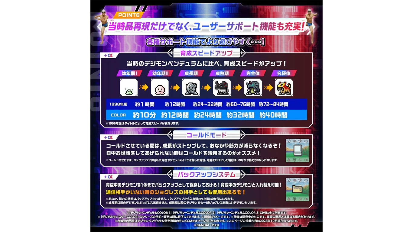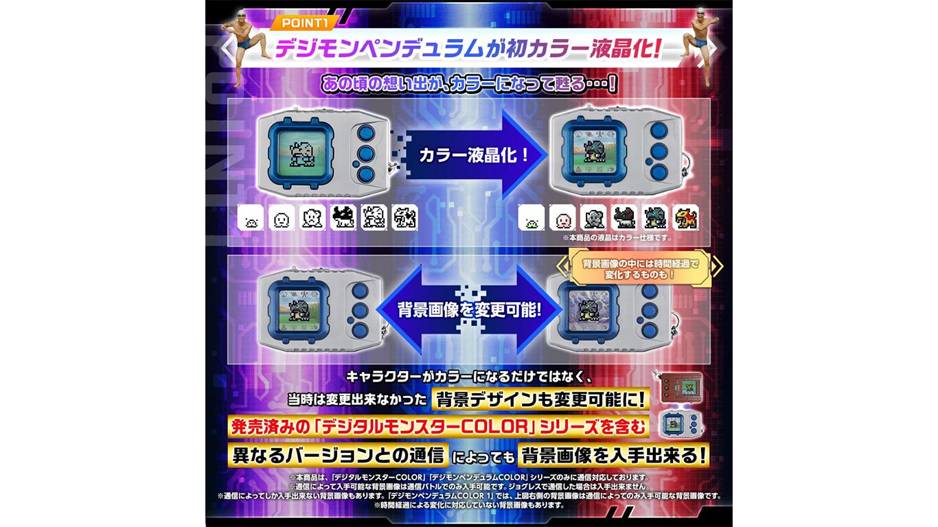 Like the DIGIMON COLOR series, the new color LCD on the Digimon Pendulum not only turns Digimon into color but brings characters and background images to life, which was impossible at the time.